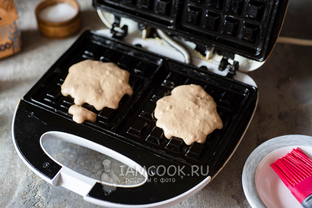 Тонким слоем растительного масла смажем рабочие поверхности вафельницы, включим разогреваться на 2-3 минуты, затем на каждую панель выложим по одной столовой ложке гречневого теста.