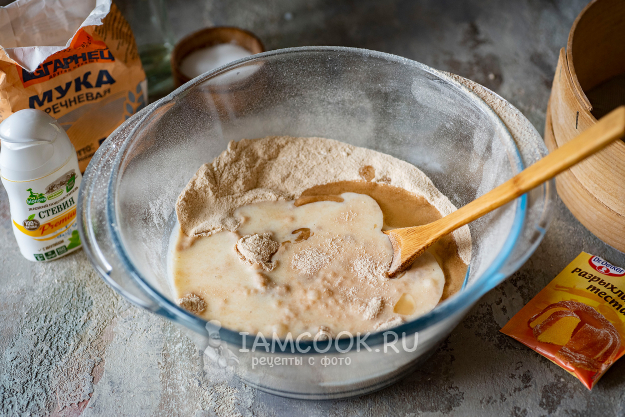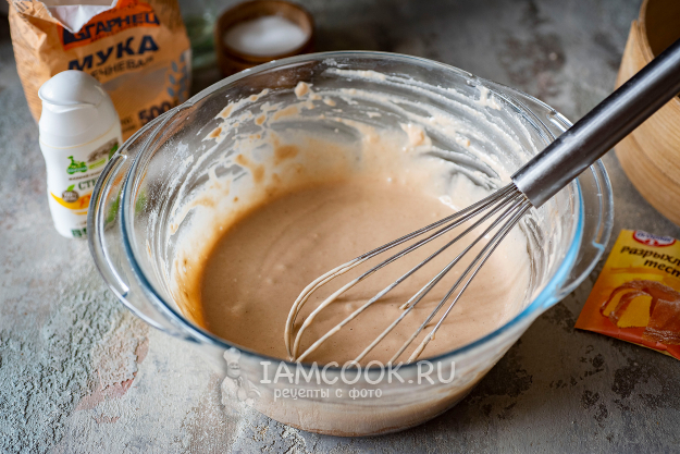 Активно перемешаем венчиком до получения вязкого однородного теста.