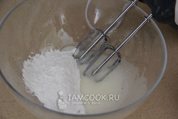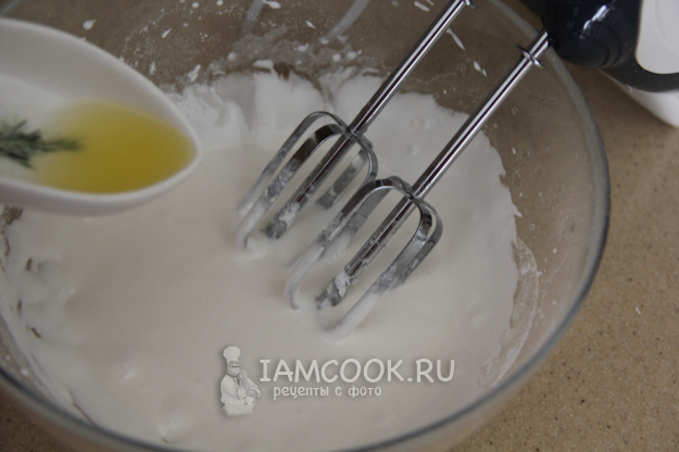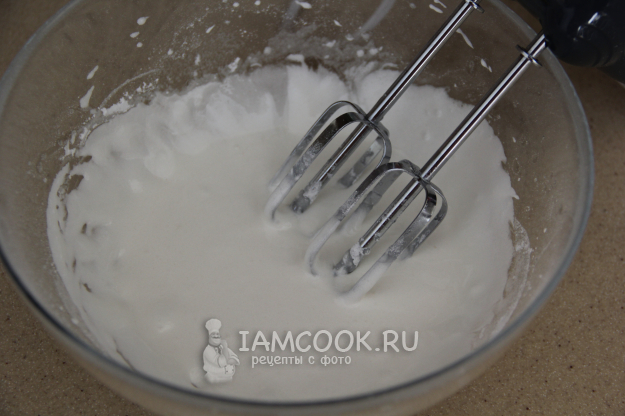 Охлажденный белок взбить миксером в пышную пенку, затем в несколько приёмов ввести сахарную пудру.
