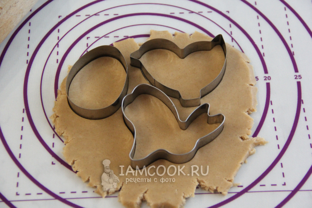 Раскатать тесто скалкой, толщина - примерно 0,5 см. С помощью вырубки сформировать пряники.