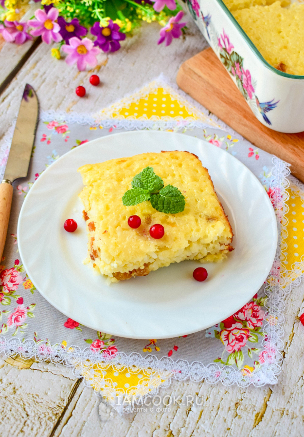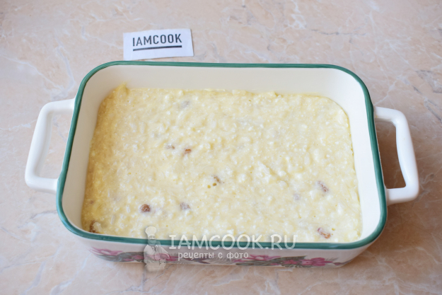 Выложите подготовленное творожное тесто с рисом и равномерно распределите его по всей поверхности. Поставьте форму в духовку, предварительно разогретую до 180 градусов, на 30-35 минут.