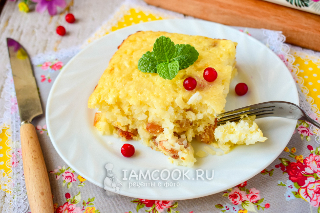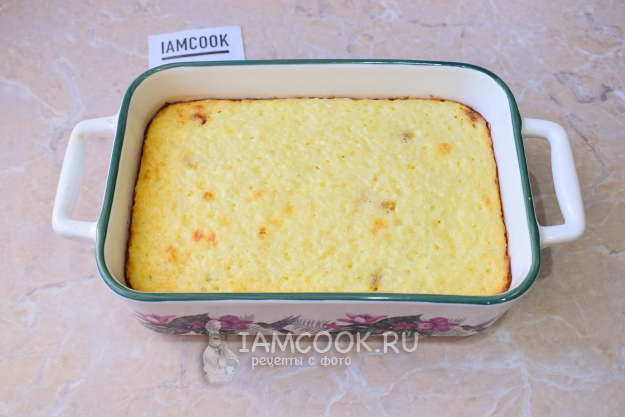 Готовая творожная запеканка с рисом и изюмом начнет подрумяниваться по краям и станет золотистого цвета. Извлеките её из духовки.