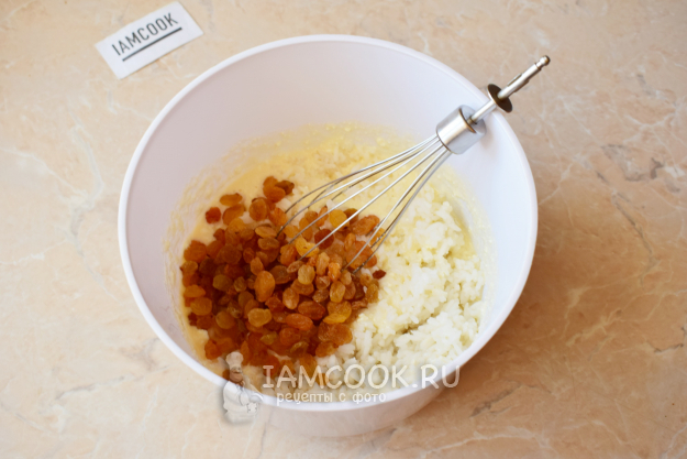 Добавьте в чашу щепотку соды, отварной рис и изюм. Перемешайте все ингредиенты до однородной консистенции.
