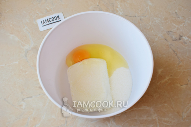 Для приготовления соедините творог с яйцом и сахаром. Добавьте щепотку соли. Смешайте.