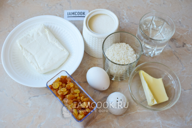 Для приготовления творожной запеканки с рисом и изюмом подготовьте все необходимые ингредиенты. Творог у меня 5% жирности. Желательно, чтобы он был мягким и влажным. Для более однородной структуры его можно протереть через сито.