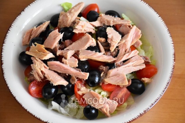 Тунца откинуть на сито, чтобы удалить лишнее масло, и выложить в салатник.