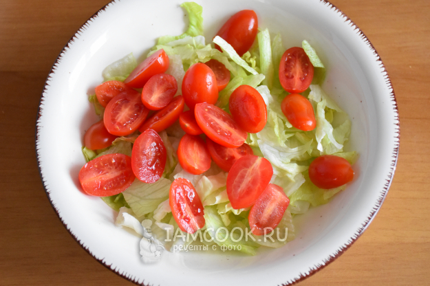 Помидоры помыть, разрезать пополам и выложить на листья салата.