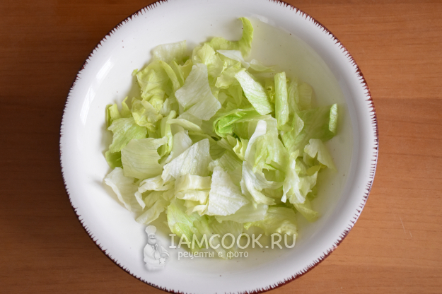 Листья салата промыть, обсушить и порвать руками. Выложить в салатник.