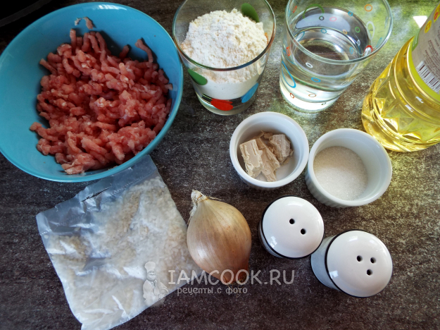 Возьмём продукты для приготовления жареных пирожков с мясом и рисом на сковороде.