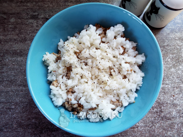 Добавить рис, посолить и поперчить.