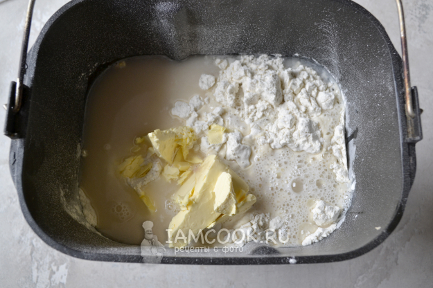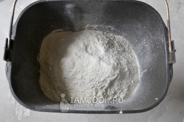 Первым делом замесите тесто. В ведерко хлебопечки просейте пшеничную муку.