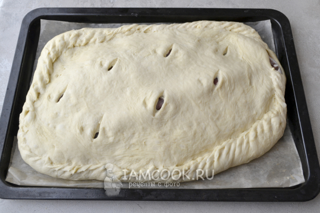 Вторую, меньшую часть теста раскатайте в пласт и положите на рыбу. Соедините нижний пласт теста и верхний, защипните края. Сделайте небольшие надрезы на тесте для выхода пара во время выпечки. Накройте пирог чистым полотенцем и оставьте для расстойки на 20-30 минут.