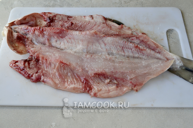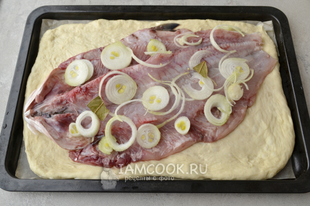 Пока тесто замешивается, подготовьте рыбу. В рецепте используется небольшая нельма. Рыбу тщательно вымойте, почистите от чешуи, удалите жабры, распорите брюшко и удалите внутренности аккуратно, чтобы не повредить желчный пузырь. Затем разрежьте вдоль позвоночника, разложив рыбу на пласт. Рыбу посолите и посыпьте черным молотым перцем. Оставьте на столе на 30-60 минут, чтобы просолилась.