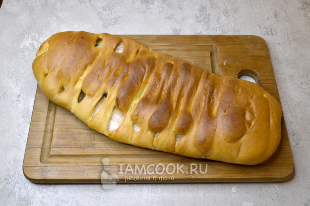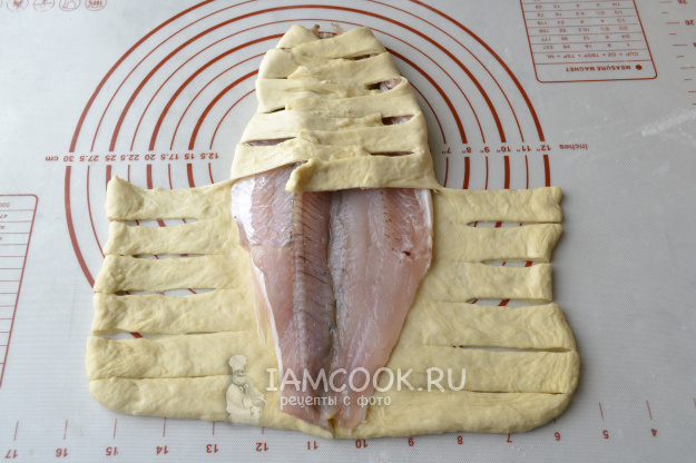 Теста получилось много, поэтому сделала еще один маленький пирог из маленького судака. Раскатайте тесто в прямоугольный пласт, положите рыбу, сделайте надрезы с обеих сторон от рыбы и заплетите косичкой.
