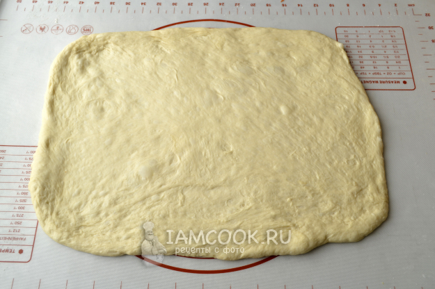 Переложите тесто на противень, застеленный пекарской бумагой.
