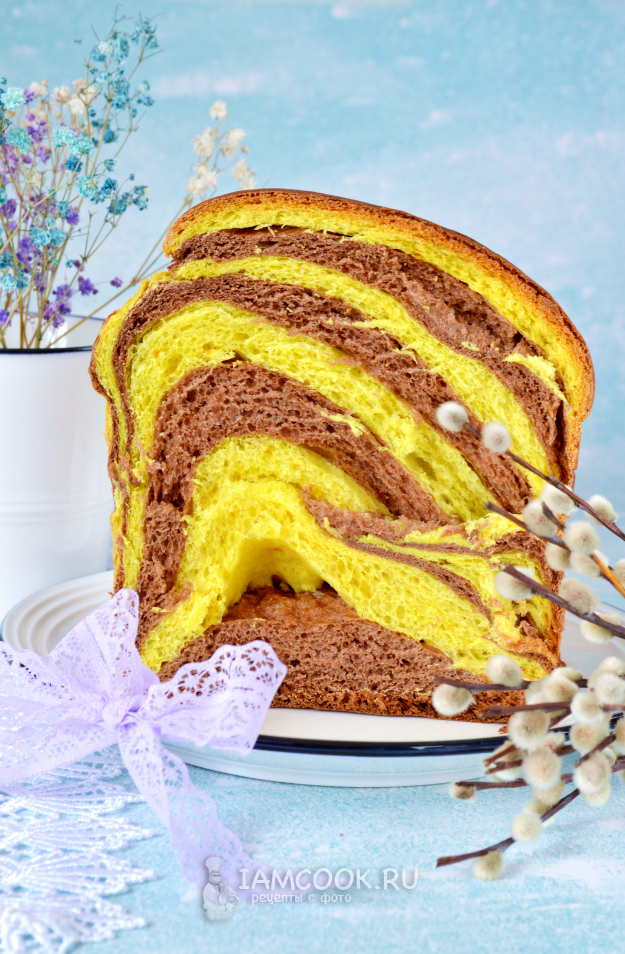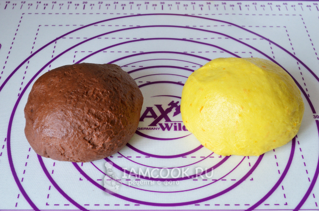Всыпать частями муку, замесить тесто. Месить долго не нужно. Разделить тесто на две равные части. В одну часть добавить цедру апельсина и куркуму, в другую - какао. Обе части теста вымесить до однородного состояния. Разложить тесто по разным мискам, затянуть пленкой и оставить в теплом месте на 1,5 часа.