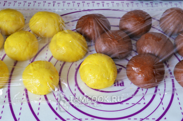 Подошедшее тесто разделить на 16 кусочков (8 апельсиновых и 8 шоколадных), подкатать их в колобки, накрыть пленкой и дать отдохнуть 10 минут.