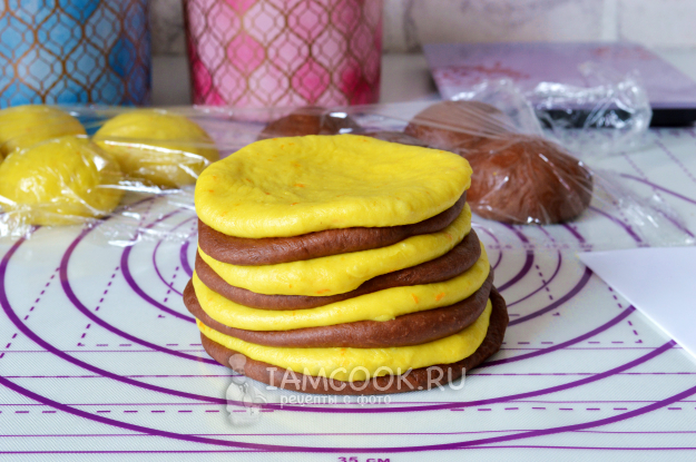 Затем колобки раскатать в круги диаметром чуть меньше диаметра формы. (Для данного количества теста понадобятся две формы диаметром 13 см.) Раскатанные круги теста сложить друг на друга по 8 штук, чередуя цвета. Получившиеся заготовки выложить в формы и отправить в теплое место на 40 минут.