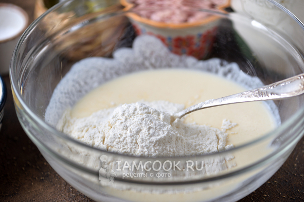 Отмерьте нужное количество муки, всыпьте соль и разрыхлитель, продолжайте взбивать тесто.
