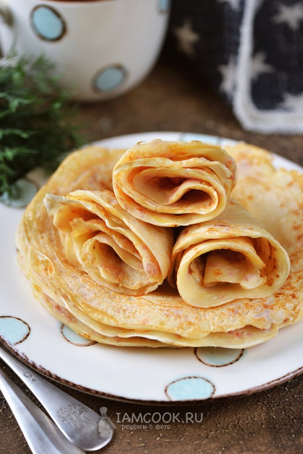 Очень вкусные блины на кефире с колбасой и сыром готовы! Такие блины не нуждаются ни в каких добавках, просто приготовьте любимый чай и можно завтракать или ужинать.