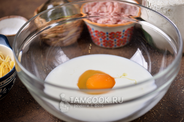 В глубокую рабочую миску влейте кефир средней жирности, вбейте яйцо, быстро взбейте их вилкой или венчиком до однородного состояния.