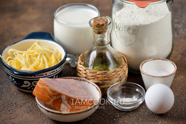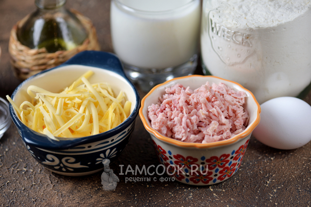 Возьмите все продукты для приготовления блинов на кефире с колбасой и сыром. Колбасу для блинов берите вареную, лучше ветчинно-рубленую.