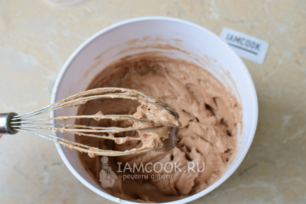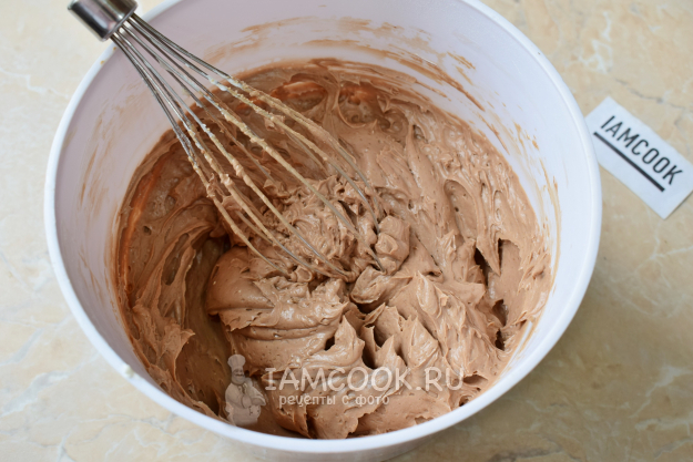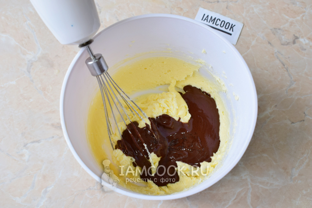 Добавьте к маслу остывший растопленный шоколад. Смешайте все миксером до однородности.