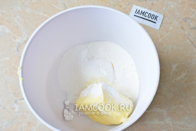 В чаше соедините мягкое масло и сахарную пудру. Взбейте.