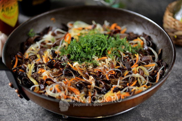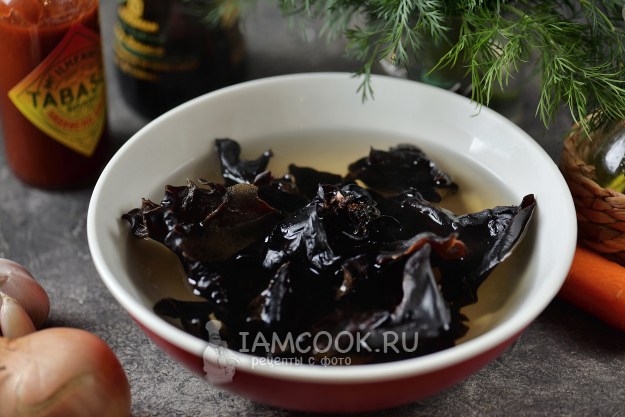 Первым делом переложите древесные грибы в глубокую миску, залейте их крутым кипятком, накройте крышкой и оставьте на несколько часов набухать. Лучше сделать это заранее, грибы должны хорошо набухнуть. Кстати, древесный гриб сильно увеличивается в объеме, учтите это.
