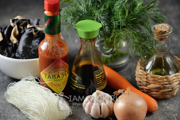 Для приготовления китайского салата с древесными грибами и фунчозой вам понадобятся все эти продукты.