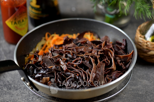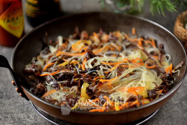 Древесные грибы откиньте на дуршлаг, нарежьте их тонкой соломкой, переложите в сковороду и обжарьте вместе с овощами тоже минуты 2-3.