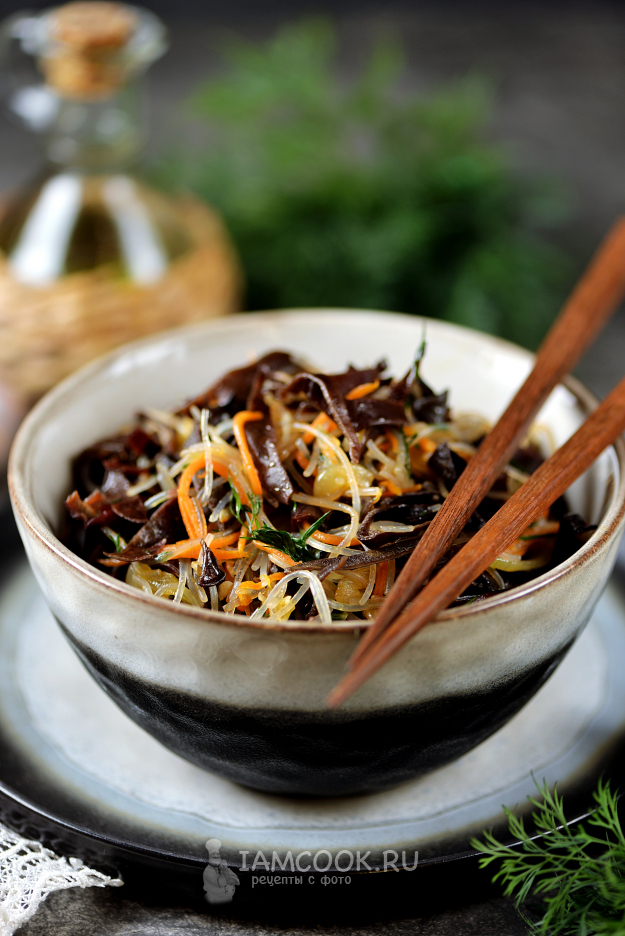 Простой и очень вкусный китайский салат с древесными грибами и фунчозой разложите по порциям и подавайте. Можно подавать его как в теплом виде, так и в полностью остывшем - одинаково вкусно.