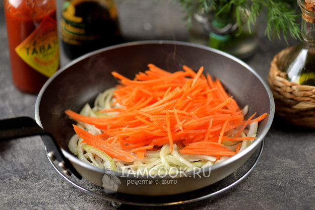 Разогрейте в сковороде растительное масло, выложите в него нарезанный полукольцами лук и тонко нашинкованную морковь. Обжарьте овощи на умеренном огне минуты 2-3.