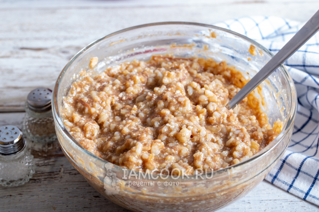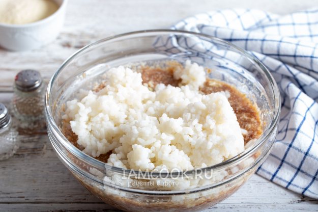 Добавьте к тушёнке отваренный и охлаждённый рис (варим в подсоленной воде в соотношении 1:3 до полного впитывания воды).