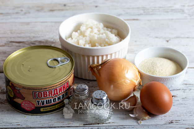 Возьмите указанные ингредиенты для приготовления котлет из тушенки с рисом. Тушёнку берите говяжью. Жарить котлеты можно на жире от тушёнки - тогда его отложите в самом начале приготовления, или на растительном масле. Муку для панировки взяла цельнозерновую, но можно и обычную.