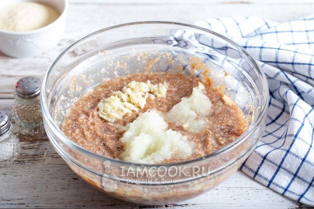 Лук и чеснок очистите. Натрите на мелкой тёрке лук и чеснок и добавьте в посуду к тушёнке.