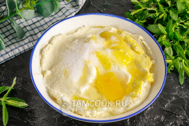 В это время выложите в глубокую емкость творожный сыр, сметану и всыпьте сахарный песок, соль. Вбейте куриные яйца и тщательно все перемешайте. Допустимо использовать различные ароматизаторы: ванильный или цитрусовый, молотую корицу и т.д.