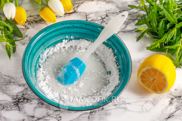 Высыпьте сахарную пудру в глубокую емкость и выжмите туда же лимонный сок. По желанию можно развести концентрированный лимонный сок водой, если у вас в наличии нет свежего лимона.