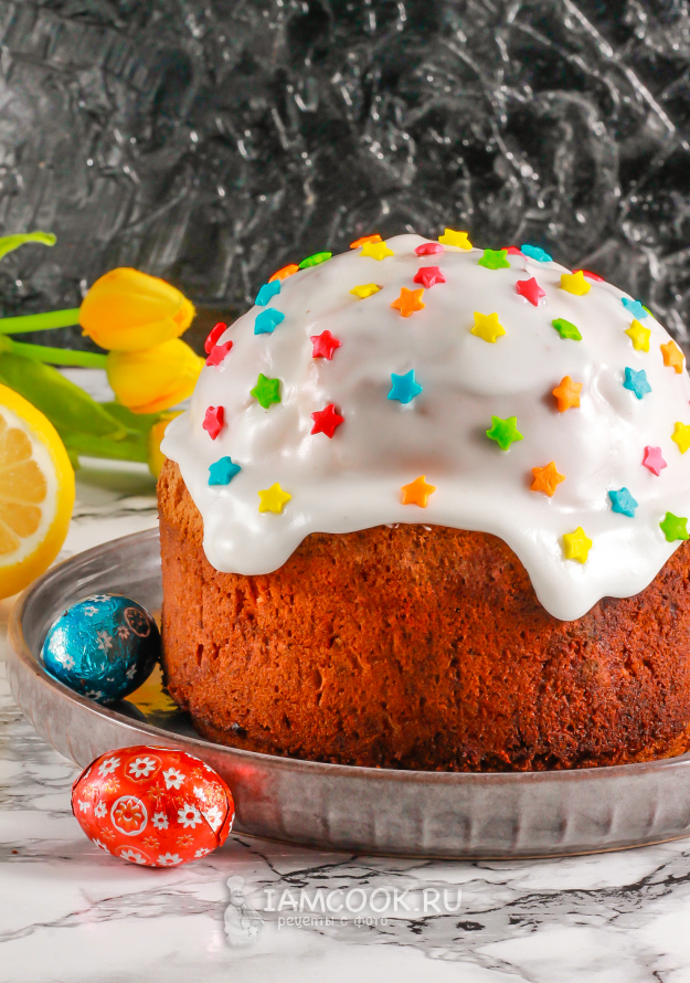 Сразу же присыпьте яркими мелкими сладкими звездочками, шариками, бусинками. Оставьте на 5-10 минут при комнатной температуре. После чего кулич можно брать с собой в церковь или подавать к столу.