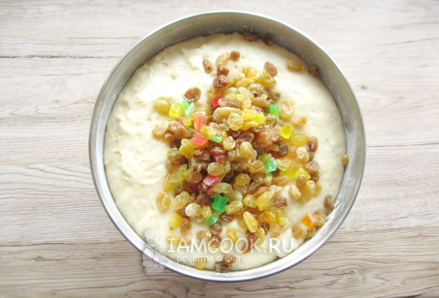 Изюм и цукаты залейте горячей водой и через 10 минут воду слейте. Выложите в миску с тестом. Снова хорошо перемешайте, накройте миску пищевой пленкой и опять поставьте в теплое место.