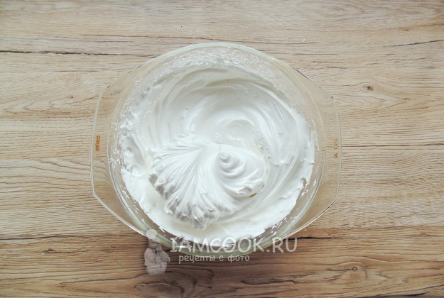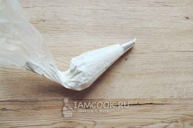 Белковым кремом заполните кулинарный мешок с насадкой. Крем я разделила на две части и в одну добавила розовый краситель.