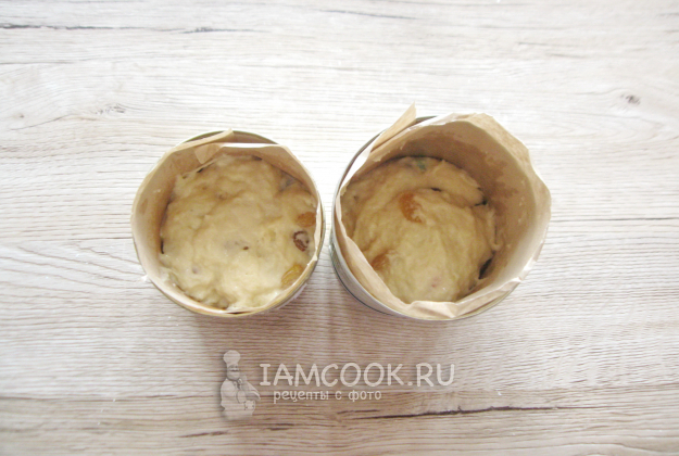 Когда тесто поднимется, разложите его по формам, заполняя на 1/3 формы. Поставьте тесто в формах на расстойку в течение 25-30 минут.