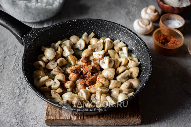 Добавим к луку, посолим, добавим специи и продолжим обжаривать все вместе 15 минут на сковороде без крышки на среднем огне, постоянно помешивая ложкой.