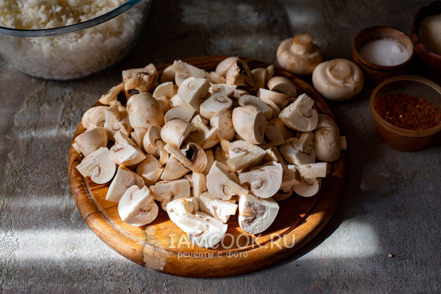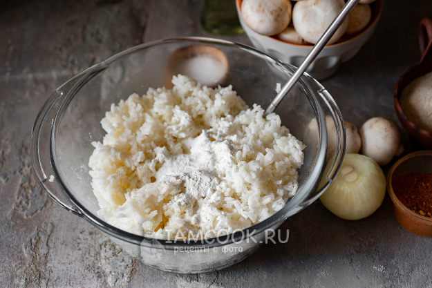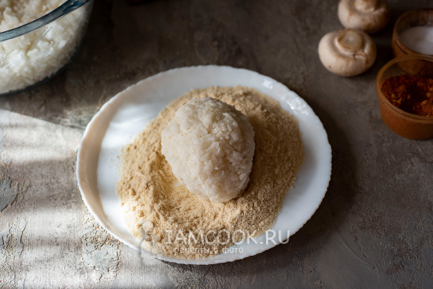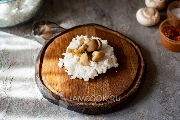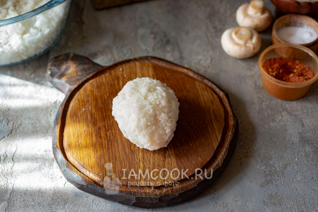 Хорошо увлажним руки и выложим на одну ладонь столовую ложку риса, приплюснем в лепешку, на центр выложим грибную массу в желаемом количестве.