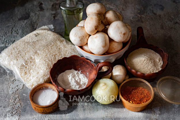 Подготовим необходимые ингредиенты для постных рисовых зраз с грибами. Грибы промоем, луковицу почистим.