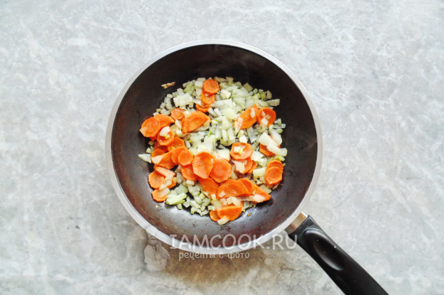 Морковь и одну луковицу очистите, помойте и нарежьте произвольно. Выложите в сковороду с маслом и слегка поджарьте до прозрачности лука.