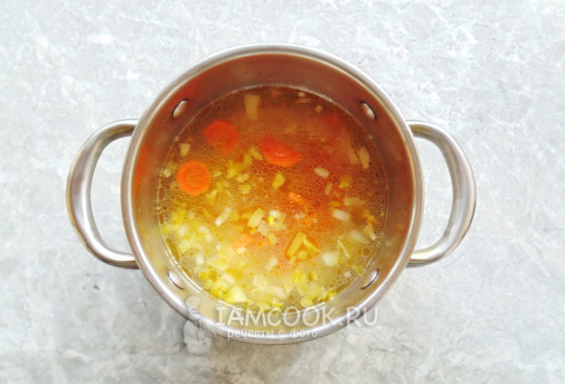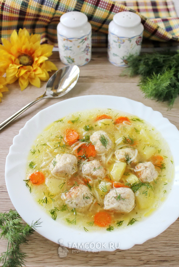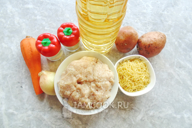 Возьмите все ингредиенты для приготовления супа с жареными фрикадельками.