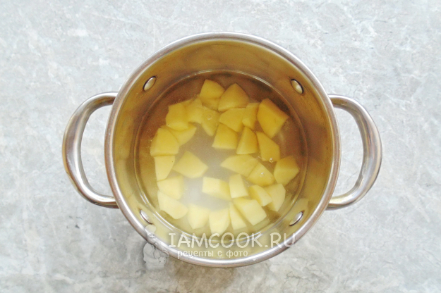 Картофель очистите, помойте и нарежьте не крупно. Выложите в кастрюлю и залейте водой. Поставьте кастрюлю на плиту и начинайте варить суп.