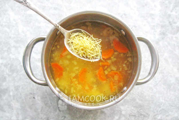 Еще через 15 минут суп посолите, поперчите по вкусу и добавьте тоненькую вермишель "Паутинка". Она варится буквально несколько минут.