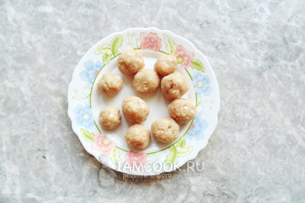 В мясной фарш (у меня - курица со свининой) добавьте половину измельченной луковицы, посолите и поперчите по вкусу, перемешайте фарш. Затем сформируйте из него небольшие шарики - фрикадельки.